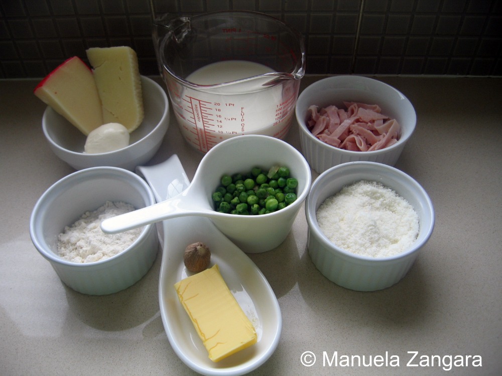 thật ra được làm từ sốt béchamel,phômai,thịt giăm bông & đậu bo.Còn