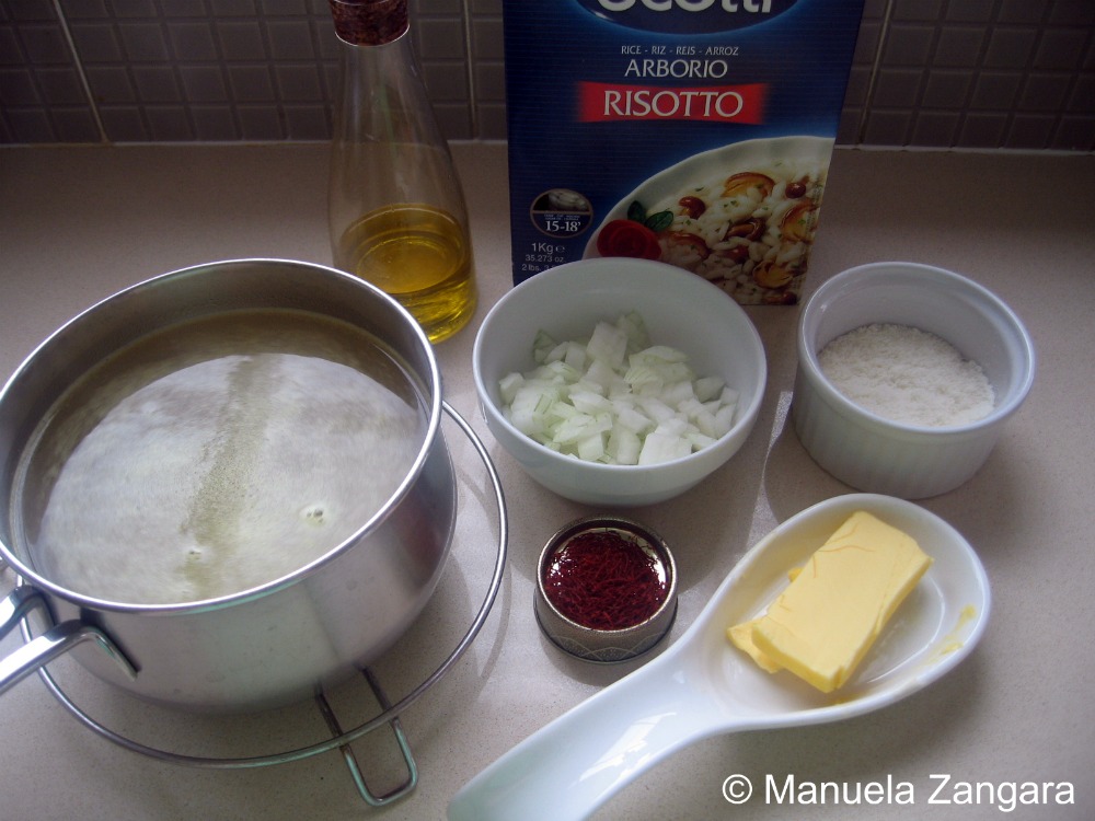 - Đảo đều tay liên tục để cơm không bị dính vào nồi & thêm nước dùng từng chút một đến khi được 1/2 quá trình nấu (khoảng 6-7p) thì cho nghệ tây vào.