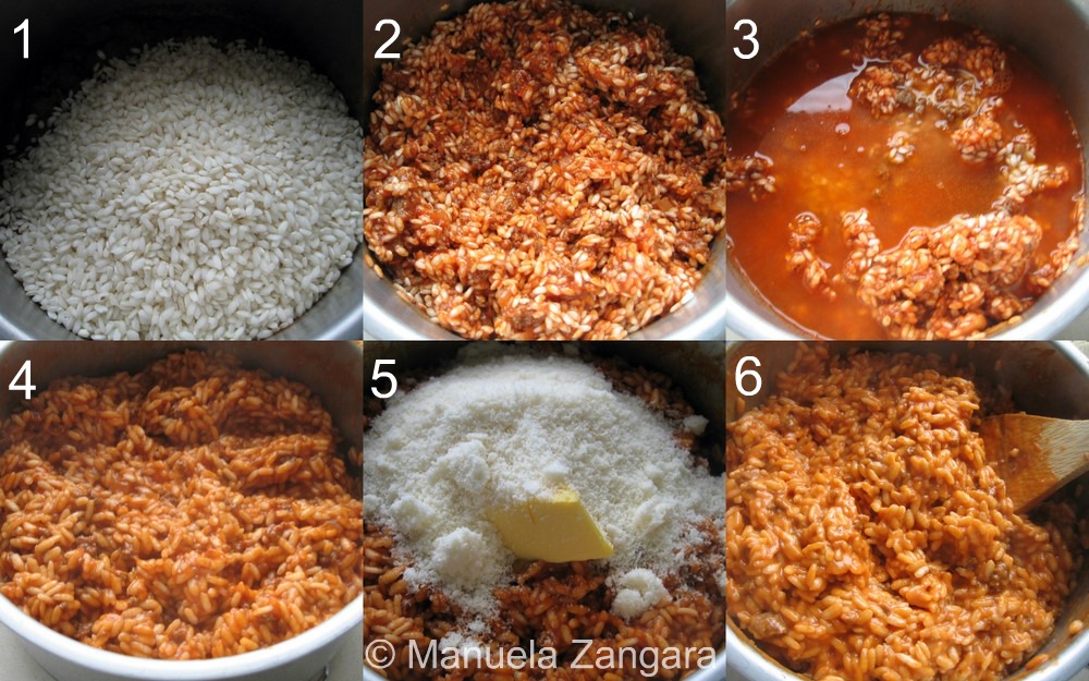 - Đổ gạo vào (H.1-H.2),châm nước dùng vào từng chút một (H.3).Nấu như nấu cơm risotto (tham khảo ở ĐÂY) & chỉ nấu trong khoảng 13p (H.4)